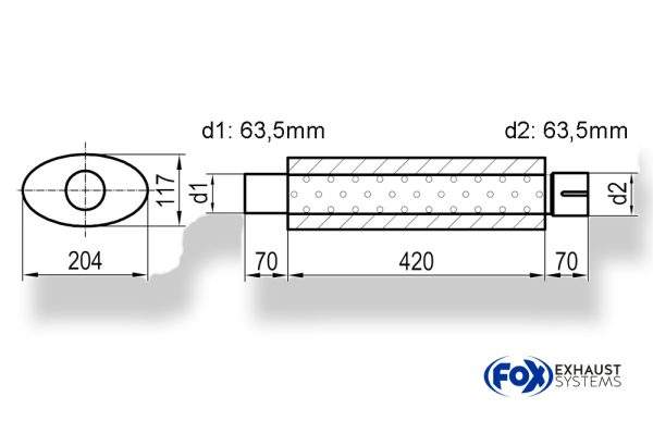 Uni-Schalldämpfer oval mit Stutzen – Abwicklung 525 204x117mm, d1Ø 63,5mm d2Ø 64mm, Länge: 420mm