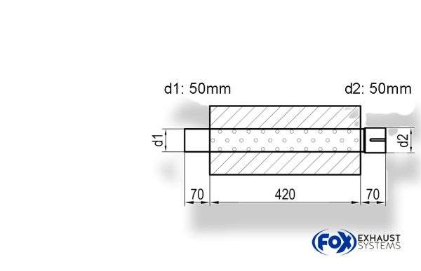 Uni-Schalldämpfer oval mit Stutzen – Abwicklung 754 278x192mm, d1Ø 50mm d2Ø 50,5mm, Länge: 420mm