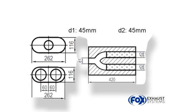 Uni-Schalldämpfer oval zweiflutig mit Hose – Abwicklung 650 262x116mm, d1Ø 45mm d2Ø 40mm, Länge: 420mm