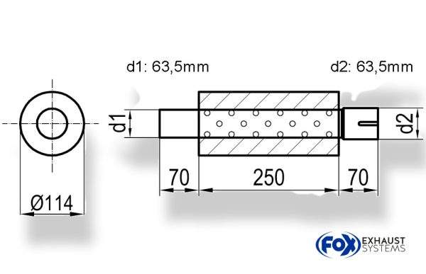 Uni-Schalldämpfer rund mit Stutzen – Abwicklung 355 Ø 114mm, d1Ø 63,5mm d2Ø 64mm, Länge: 250mm