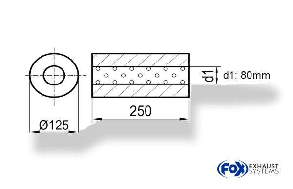 Uni-Schalldämpfer rund ohne Stutzen – Abwicklung 390 Ø 125mm, d1Ø 80mm außen, Länge: 250mm