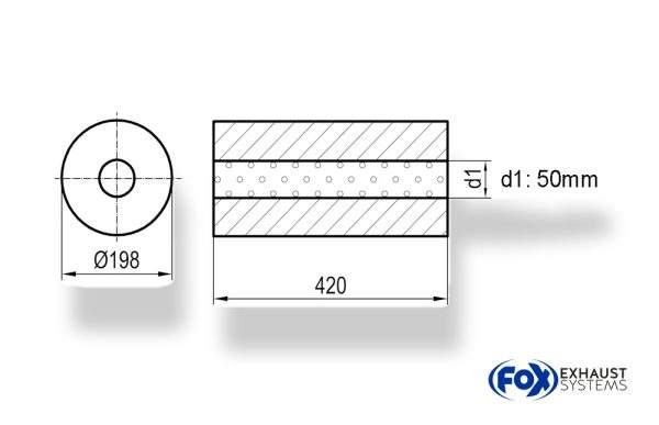 Uni-Schalldämpfer rund ohne Stutzen – Abwicklung 626 Ø 198mm, d1Ø 50mm, Länge: 420mm -Ø 198mm