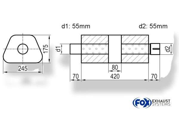 Uni-Schalldämpfer trapez mit Kammer + Stutzen – Abw. 711 245x175mm, d1Ø 55mm (außen), d2Ø 55mm (innen), Länge: 420mm